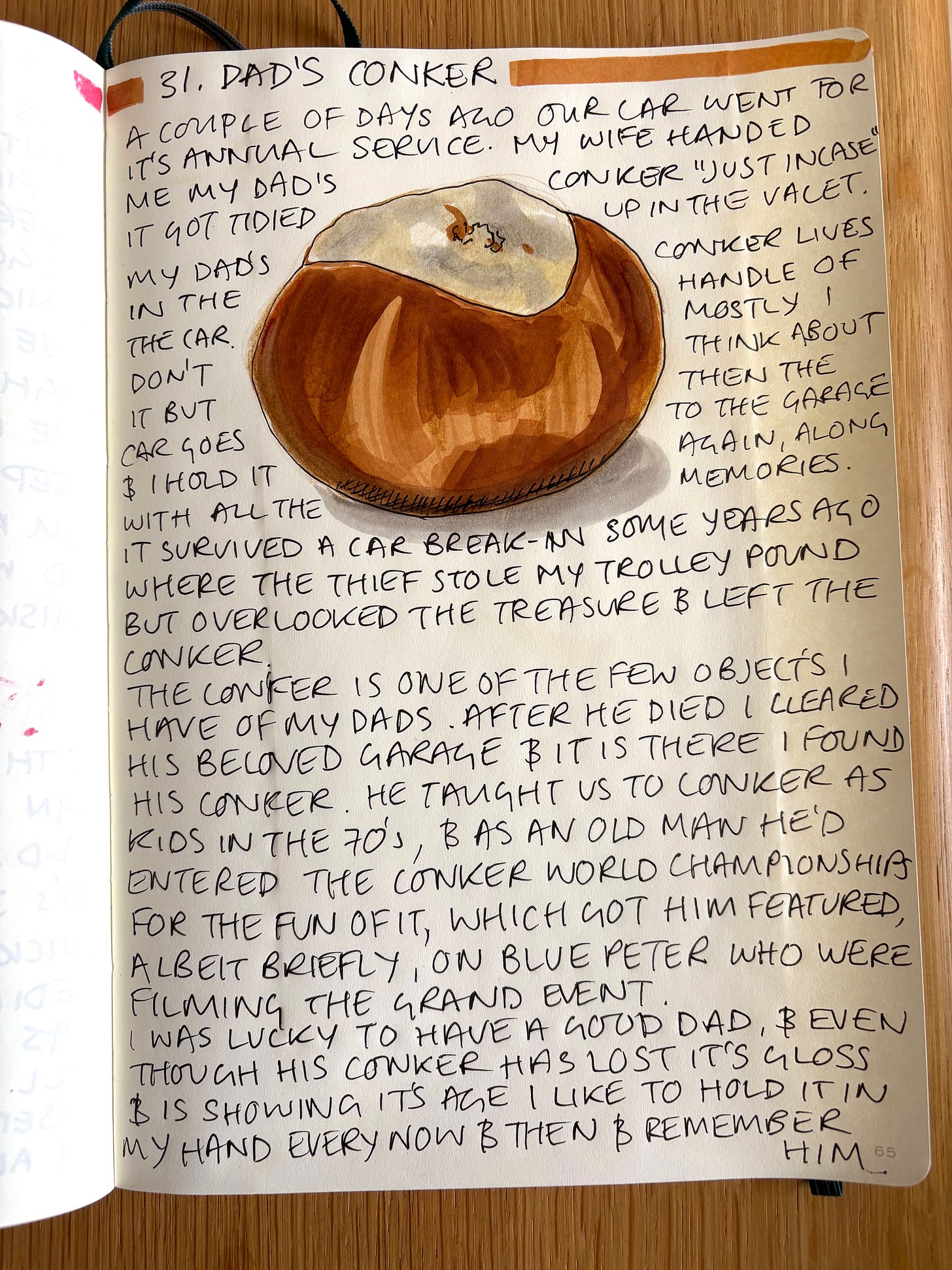 The conker is one of the few objects I have that was my dads. After he died, I cleared out his beloved garage and it is there, amongst a million nails and widgets that I found his conker. He’d taught us to conker as kids in the 70’s and as an older man he had entered the conker world championships which got him featured, albeit briefly, on Blue Peter* who were filming the grand event.